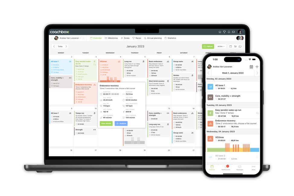 Integrate strength training into your athletes' training plan. Use our workout builder to create strength, core, mobility, ... workouts with video integration. Coachbox is a complete multi-sport environment with integrated workouts that can be performed by your athletes through our mobile app.